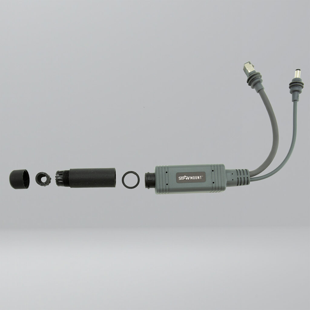 The MINI POE Receiver features two fixed cables: one Ethernet cable and one DC barrel connector. Both cables include Starlink weather seals and are designed to connect directly to the two ports on the Starlink MINI, providing power via the DC barrel connector and network connectivity via Ethernet.