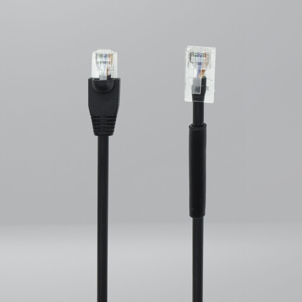 The cable end on the right has no boot or strain relief, allowing the RJ45 connector to pass through the seal body correctly and seat fully within the bayonet fitting. It also features a collar which ensures the cable is correctly sized, enabling the rubber cable grommet to compress evenly and create an effective seal.